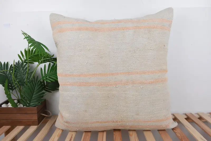 Beige & Orange gestreiftes Wurfkissen, besticktes Vintage-Kissen
