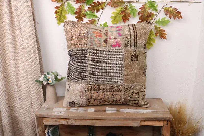 Braunes und rosafarbenes Patchwork-Wurfkissen, 22x22 besticktes Kissen