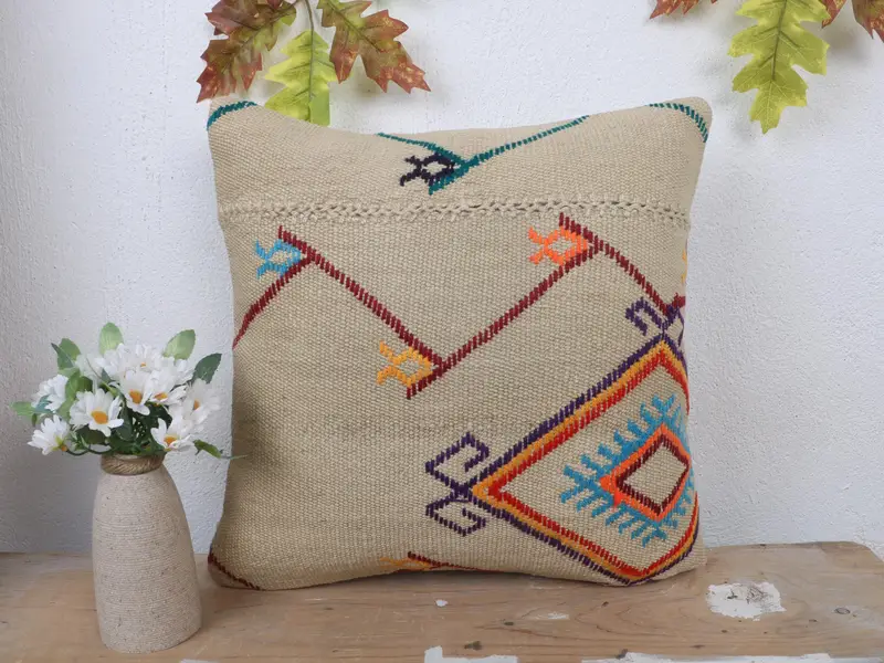 Geometrisches Kissen in Beige und Orange, handgefertigtes Leinenkissen