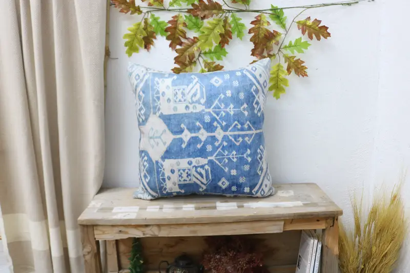 Besticktes blau-weißes Wurfkissen, quadratisches Vintage-Kissen