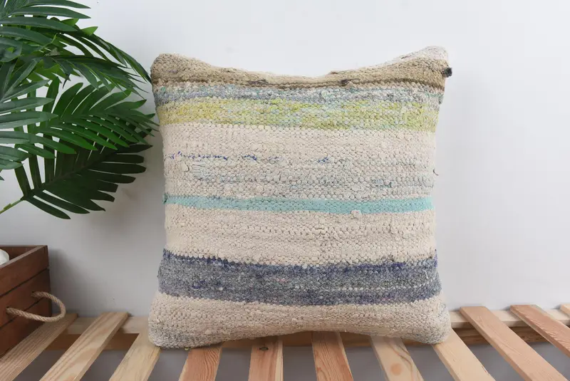 Beige & Bronze gestreiftes Kissen, Vintage besticktes Leinenkissen