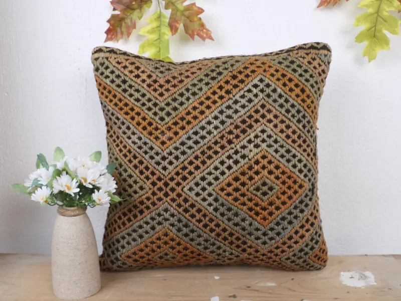 Braunes und beiges geometrisches Kissen, Vintage besticktes Kissen