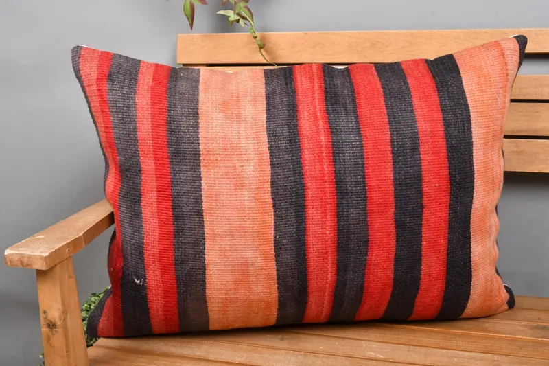 Rot-braun gestreiftes Wurfkissen, handgefertigtes Leinen- und Wollkissen