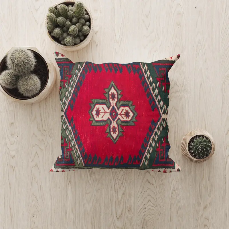 Handgefertigtes besticktes Kissen, rot-grünes Vintage-Kissen