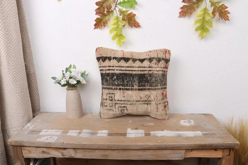 Geometrisches Kissen in Beige und Braun, Vintage-gesticktes Kissen