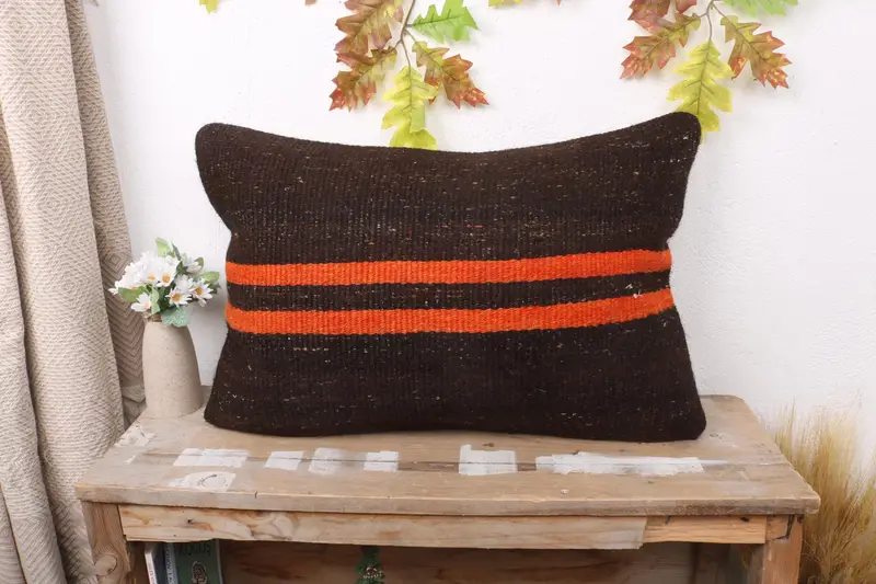 Gesticktes braunes und orangefarbenes Kissen, 16x24 handgemachtes Wurfkissen