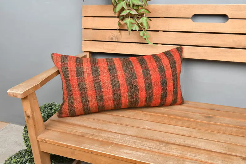 Braun & rot gestreiftes Wurfkissen, besticktes Leinenkissen