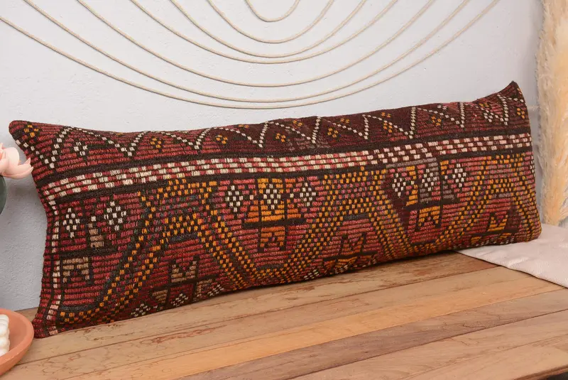 Handgefertigtes geometrisches Leinen-Wurfkissen in Orange und Beige, Vintage-Rechteckkissen