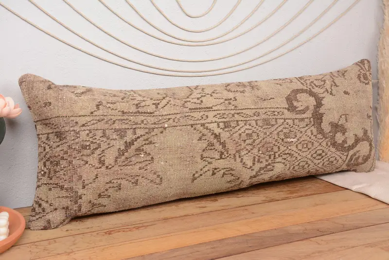 Gesticktes Beige & Braunes Blumenkissen, handgemachtes rechteckiges Wurfkissen