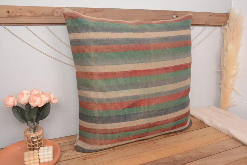 Handgefertigtes grün-rot gestreiftes Kissen, Vintage besticktes Kissen