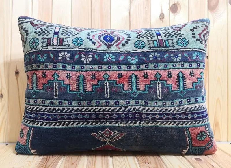 Handgefertigtes Wollkissen, geometrisches grünes und bronzefarbenes Rechteckkissen