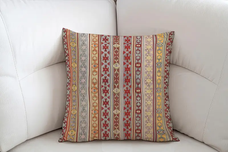 Geometrisch besticktes Wurfkissen, graues Leinenkissen mit roten Akzenten