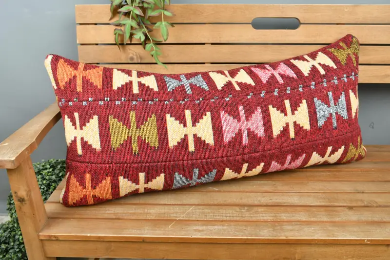 Rot & Orange besticktes Kissen, 16x36 handgemachtes Wurfkissen