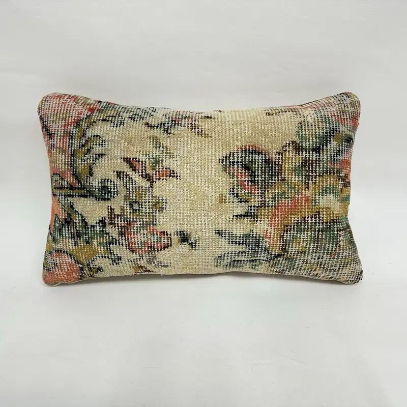Beige & grün floral besticktes Wurfkissen, 12x20 handgemachtes Leinenkissen