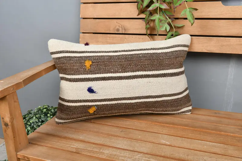 Beige & braun gestreiftes Wurfkissen, besticktes Leinenkissen