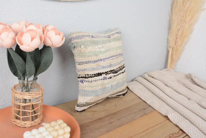 Beige, grün gestreiftes Wurfkissen, 12x12 besticktes Kissen