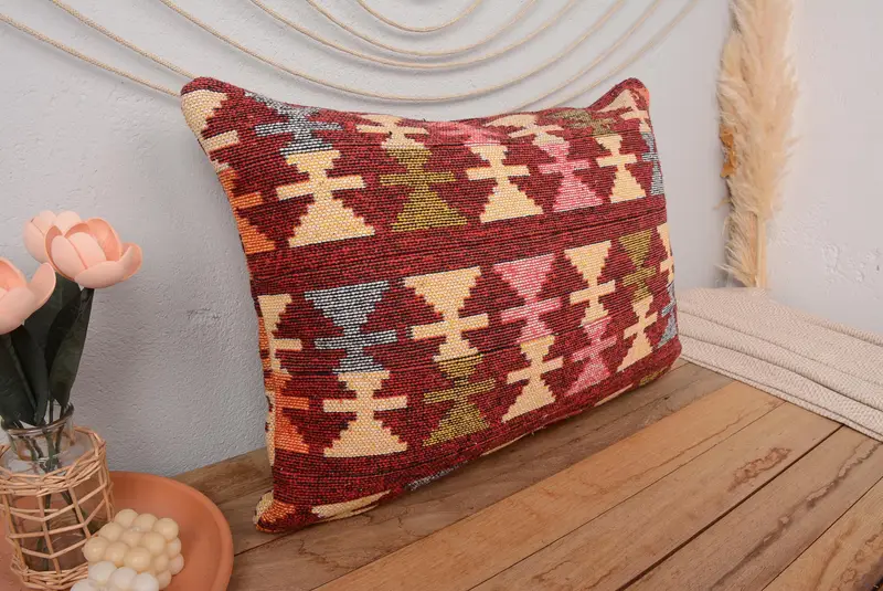Rot & Beige besticktes Kissen, 20x28 handgemachtes Wurfkissen