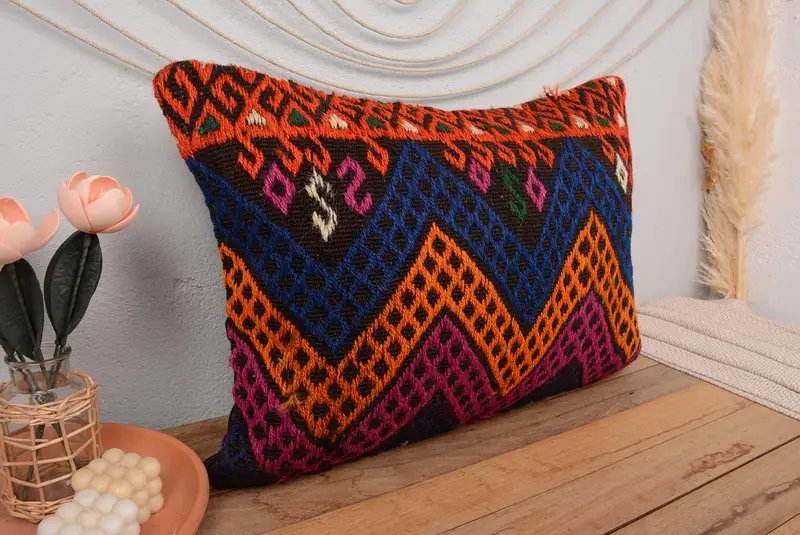 Orange & Rot besticktes Wurfkissen, 20x28 handgemachtes Leinenkissen