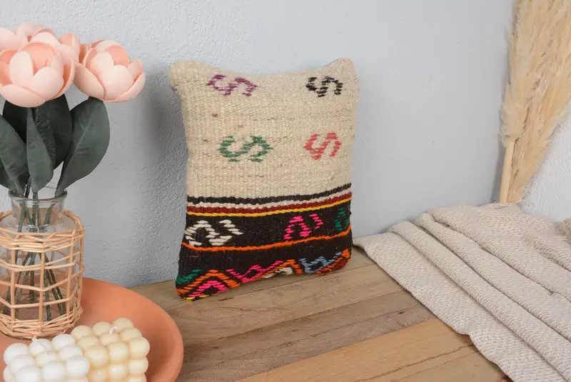 Beige & Orange besticktes Wurfkissen, geometrisches Vintage-Kissen
