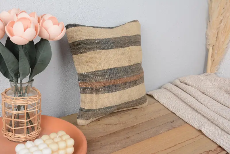 Beige & braun gestreiftes Wurfkissen, Vintage besticktes Kissen