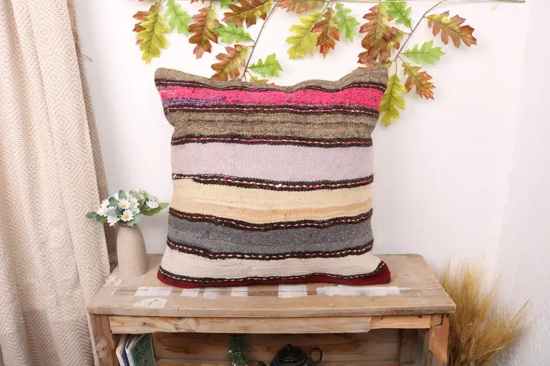 Gesticktes rosa und grau gestreiftes Kissen, 22x22 handgemachtes Wurfkissen