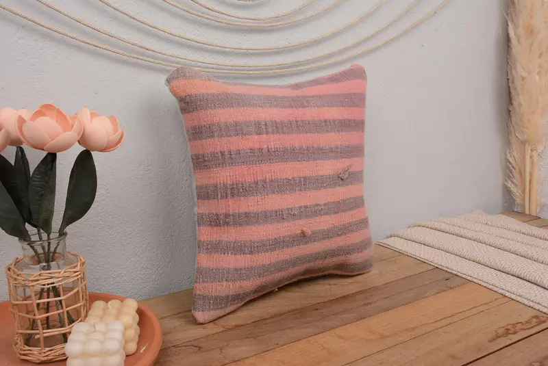 Rosa und braun gestreiftes Kissen, besticktes Vintage-Kissen