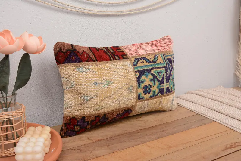 Besticktes Patchwork-Wurfkissen in Beige und Grün, handgefertigtes Vintage-Kissen