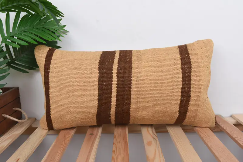 Beige und braun gestreiftes Kissen, 24x12 besticktes Wurfkissen