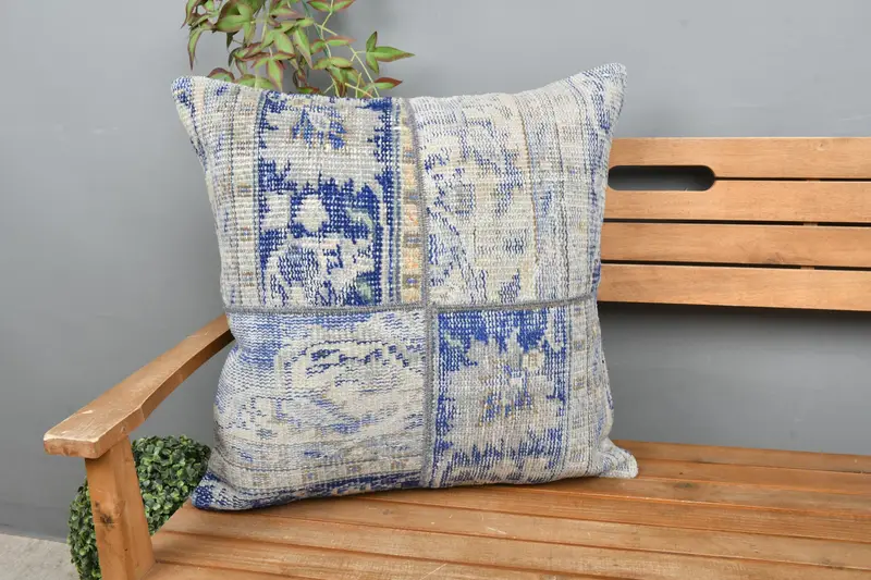 Handgefertigtes Patchwork-Wurfkissen in Blau und Beige, 24 x 24 Vintage-Kissen