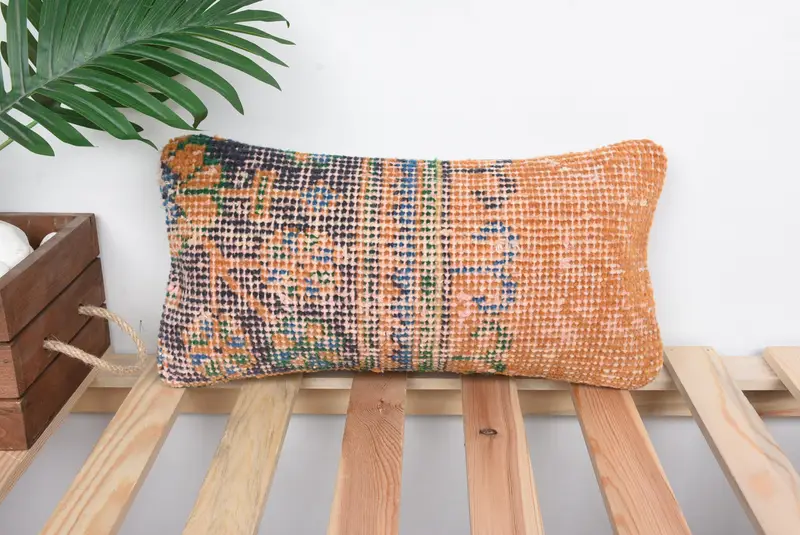 Gesticktes orangefarbenes und grünes Blumen-Wurfkissen, Vintage-Rechteckkissen