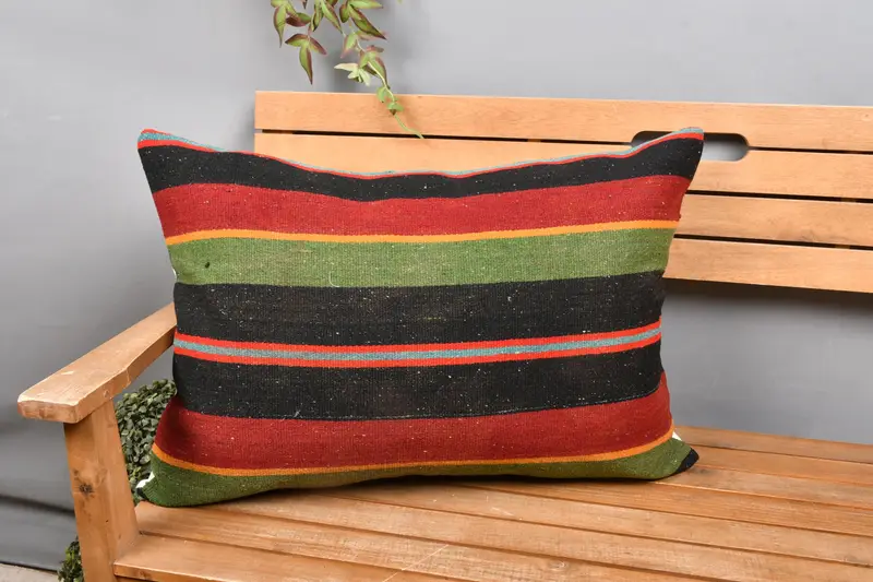 Braun & grün gestreiftes Leinen-Wurfkissen, handgefertigtes rechteckiges Kissen