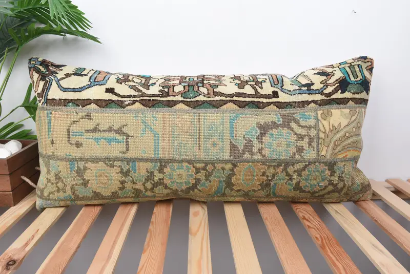 Blaues und braunes Patchwork-Wurfkissen, handgefertigtes besticktes Kissen