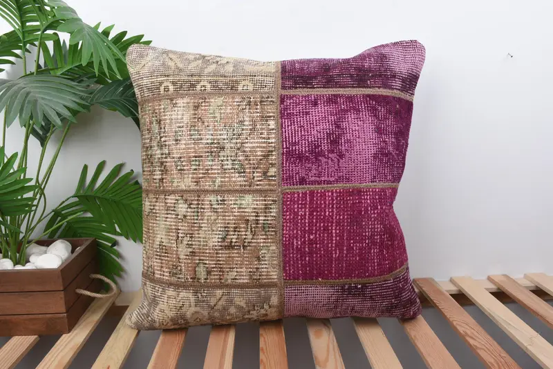 Lila & Braunes Patchwork Kissen, Vintage besticktes Kissen