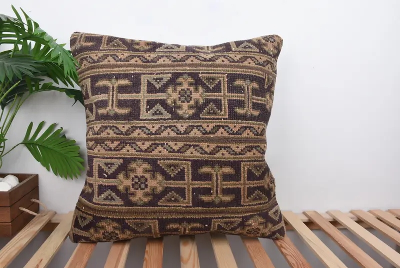 Blaues und braunes Patchwork-Wurfkissen, 24x24 besticktes Vintage-Kissen