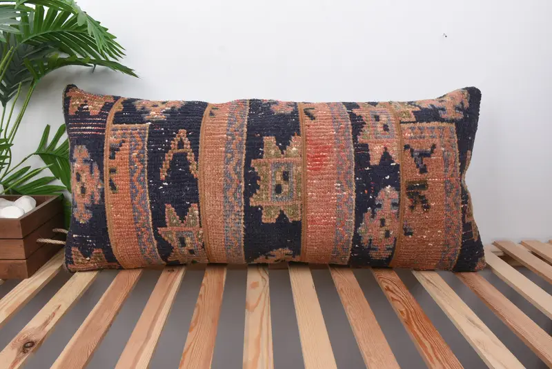 Blaues und oranges rechteckiges Patchwork-Wurfkissen, handgefertigtes Vintage-Kissen