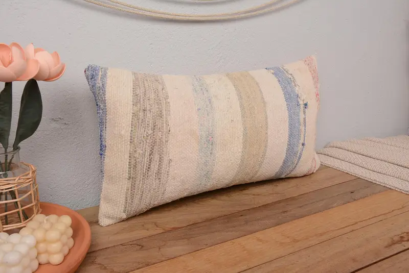 Beige & braun gestreiftes Wurfkissen, Vintage besticktes Kissen
