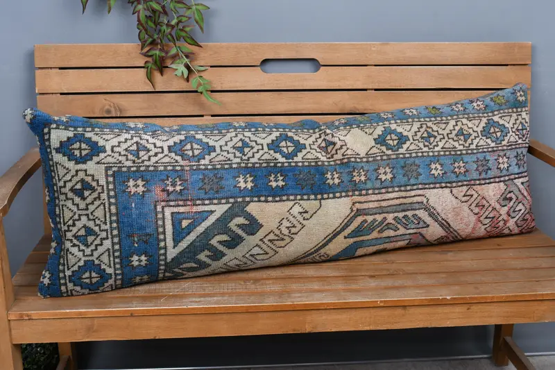 Blaues und beiges geometrisches Kissen, handgefertigtes besticktes Kissen