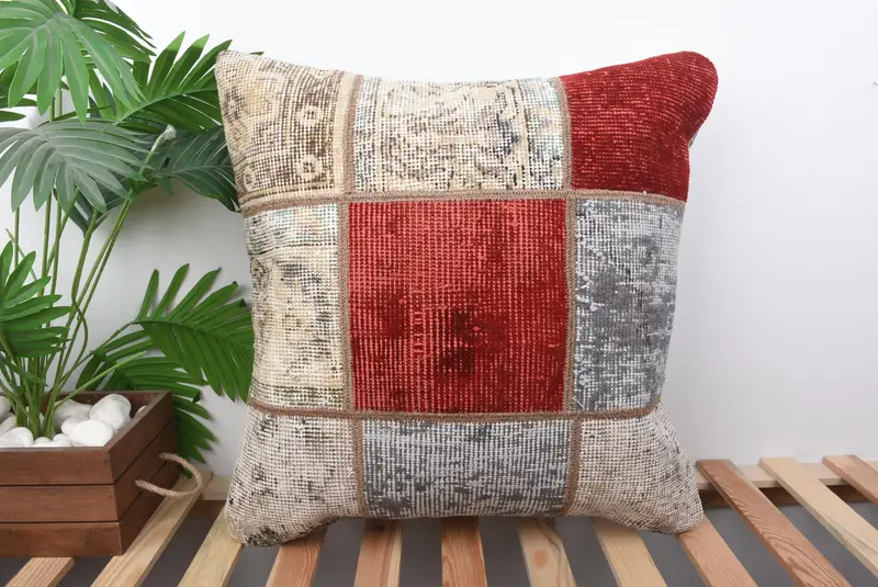 Rotes, graues Patchwork-Wurfkissen, 22x22 besticktes Kissen, handgefertigtes Vintage-Design