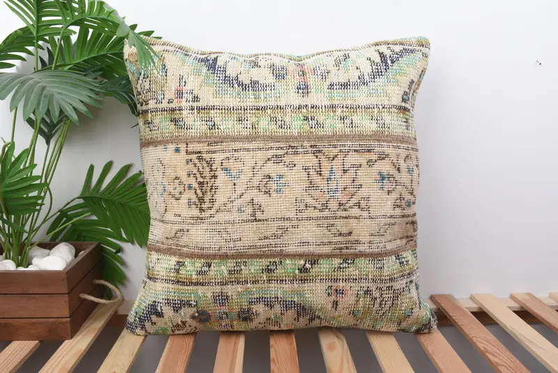 Beige & grünes Patchwork-Wurfkissen, 22x22 Vintage-Kissen