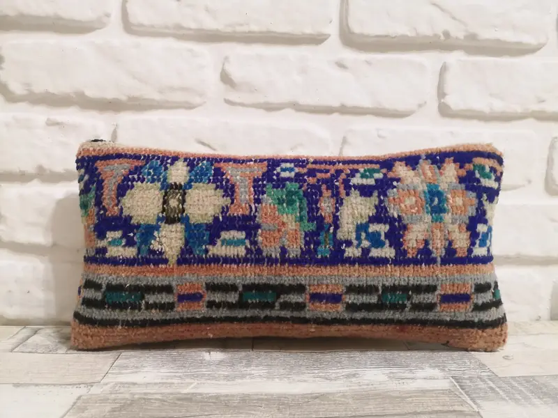 Handgefertigtes blaues und orangefarbenes geometrisches Wollkissen, Vintage-Dekor