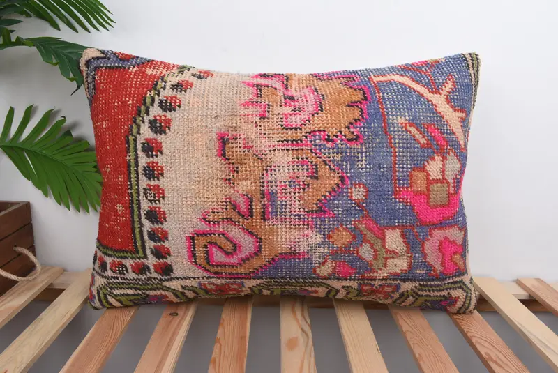 Blaues und rotes Southwestern-Wurfkissen, handgefertigtes Kissen aus Leinen und Wolle