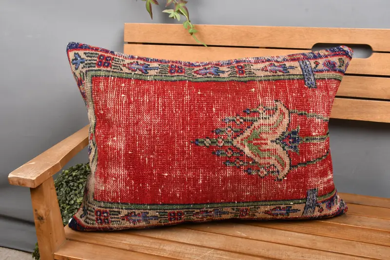 Rotes Leinen-Wurfkissen mit Blumenstickerei, 20x28 Vintage-Kissen