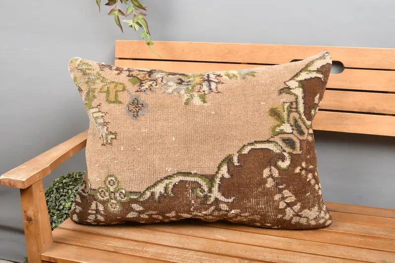 Besticktes Leinen-Wurfkissen, braunes und beiges Blumenkissen
