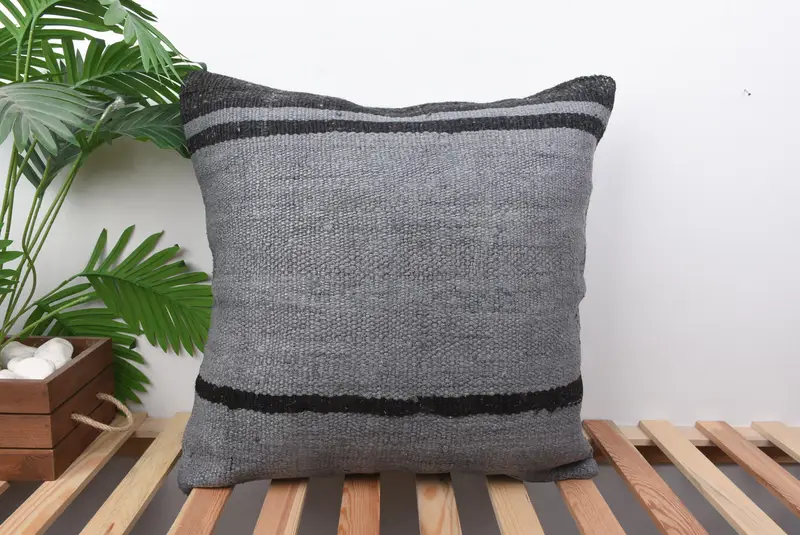 Grau-schwarz gestreiftes Leinen-Wurfkissen, 22x22 besticktes Kissen