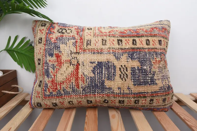 Blau & Rot gestreiftes Kissen, handgemachtes besticktes Leinenkissen