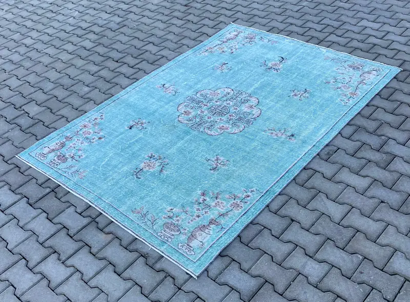 Blauer, beigefarbener Blumenteppich, 5,4 x 8,2 Fuß, schickes Dekor