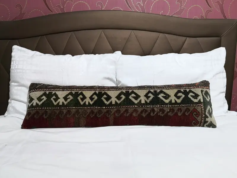 Handgefertigtes Wollkissen, rechteckiges grün-weiß besticktes Kissen