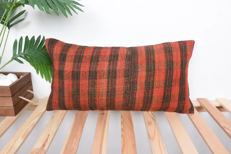 Braun & rot gestreiftes Kissen, handgefertigtes besticktes Kissen