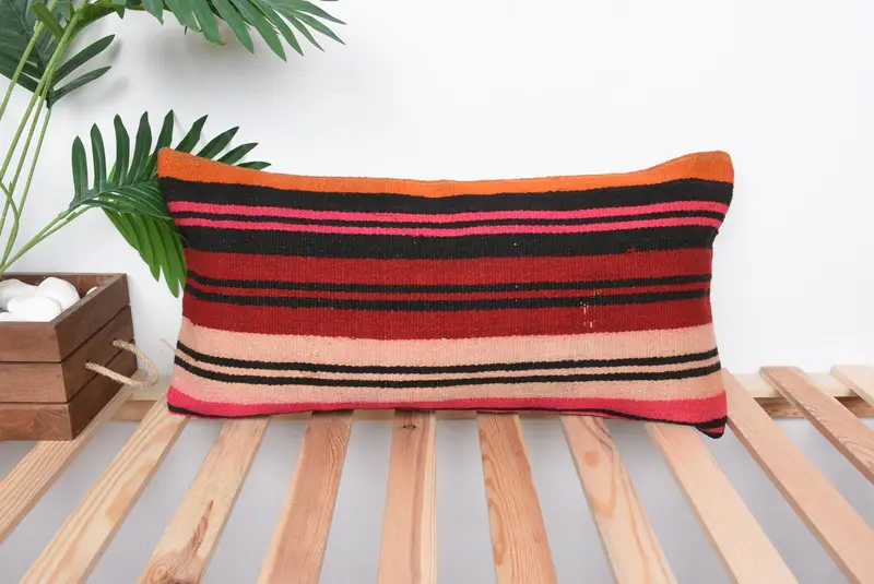 Rosa und rot gestreiftes Leinen-Wurfkissen, Vintage besticktes Rechteckkissen