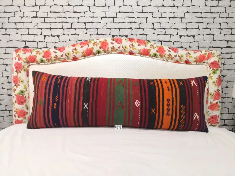 Handgefertigtes gestreiftes Wollkissen, Vintage-Rechteckkissen in Rot und Orange